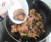 3.干香菇洗净以后,泡香菇的水就干净了,用来炖鸡块,很美味的,可不要浪费了。