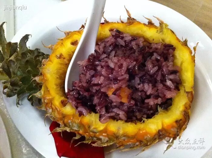 此饭是最具有傣族特色的糯制食品。制作时,将用水浸泡7至8小时的紫糯米淘洗干净,与剁细的猪肉、菠萝果肉搅拌均匀,放入准备好的菠萝空心内,将切去的菠萝盖盖上,放到甑锅里蒸热后即可食用。吃时轻轻掀开甚至看不出缝隙的菠萝盖,晶莹透亮的紫糯米夹杂着果肉的香气,吃起来又糯又软,甜而不腻,非常爽口,并有补血润肺之功效。