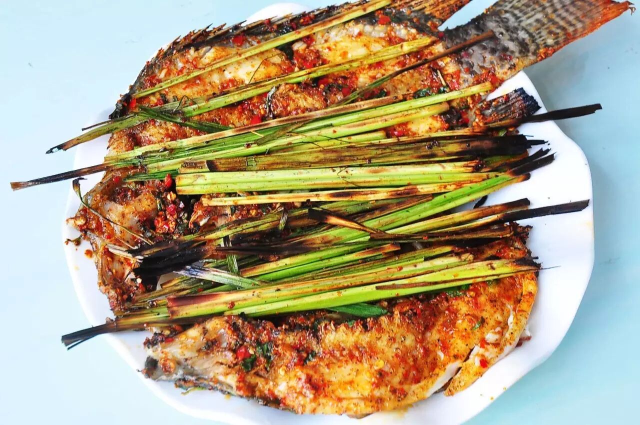 香茅草烤鱼制作时先将葱、姜、蒜、青椒、芫荽等佐料切细,拌上盐,放进刮洗干净的鱼肚里,用香茅草叶捆好,再用竹片夹紧放在火炭上烘烤,待八成熟时抹上猪油,继续烘烤5分钟左右即可食用。这种烤鱼具有香、酥、脆的特点,极能增进食欲。