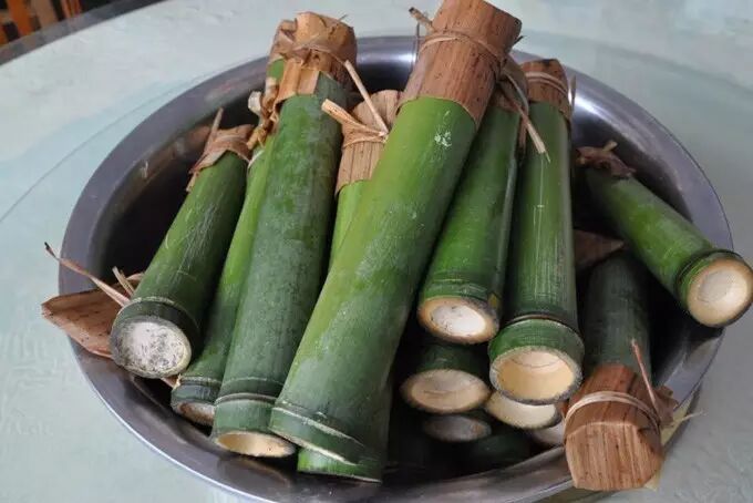 竹筒饭源于傣族先民上山打猎、出远门做活时不便带锅碗,就地取材煮制的饭食。做饭时先砍下新鲜竹节,装入糯米,略加清水浸泡,再用干净的芭蕉叶或甘蔗叶塞住筒口,放在火塘内用文火烘烤直至将水煮干。吃时将竹筒饭砍成两半,放在木板或地板上轻敲数遍,剥去竹筒的薄皮,便获得一条圆柱形的米饭。此饭融糯米香、青竹香于一体,口感柔韧丝滑,满齿留香,是最具民族特色的风味食品。