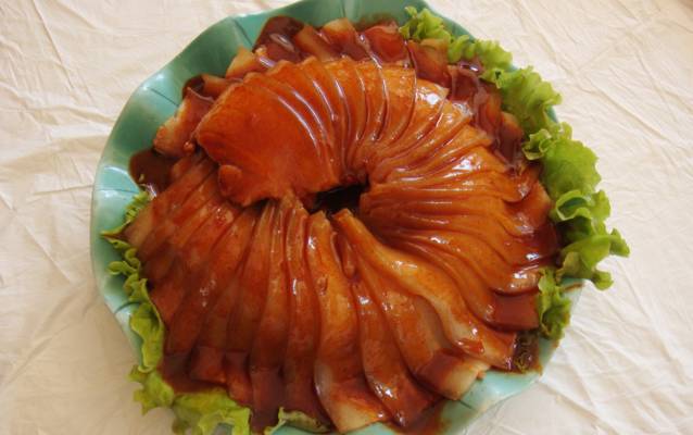 7.将碗中的梅菜五花肉倒扣在盘子里,浇上芡汁即可。