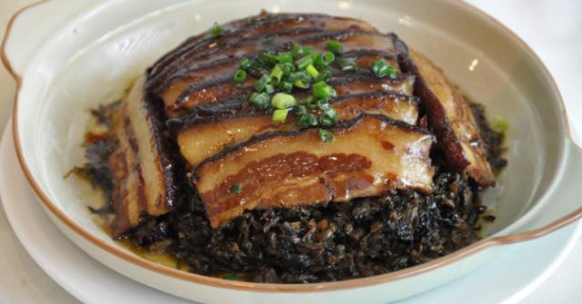7.为了干菜的味道均匀,可再把干菜扣肉倒回锅中,用锅铲拌匀,盛起即可。