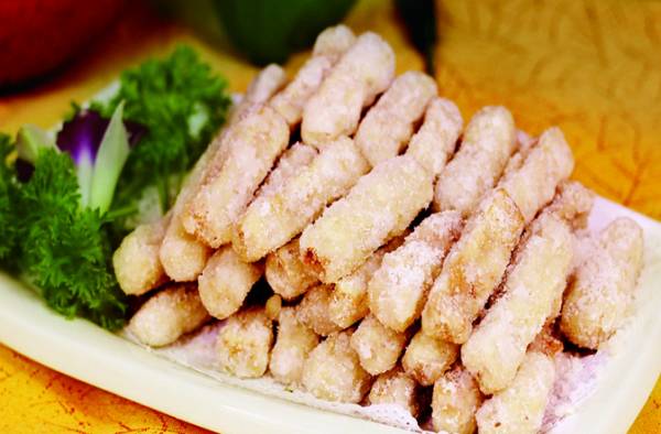 2、锅中倒入适量食用油,待油热6成后,下芋头条小火炸3分钟左右后捞出,稍凉后中火下过再炸一分钟上色;