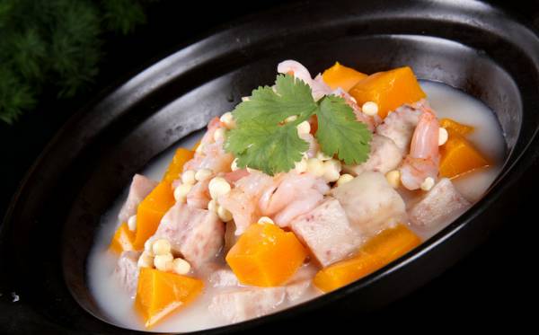 原料:虾仁、芋头、玉米粒、香菜、米酒、生姜、盐、蛋清。