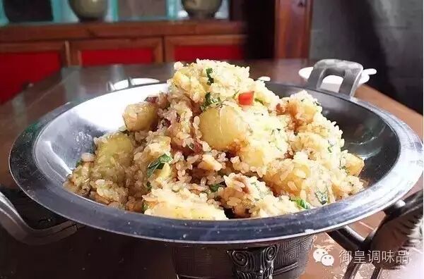 1、把糯米用清水泡涨后,入笼蒸熟,取出来加花雕酒、御皇金牌鲜味汁拌匀。另把小土豆入笼蒸熟,取出来下入七成热的油锅里炸至色金黄时,倒出来沥油。