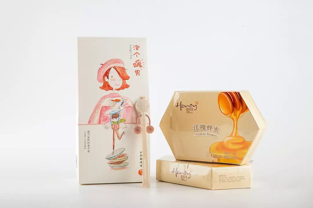 「蜂蜜姜茶套装」选用非速溶、无添加的天然生姜,保留了生姜性味辛温的天然特色;条装蜂蜜调和了姜的辛味,丰富了茶味。搭配的条状蜂蜜采用撕口设计,用后即抛,保持蜂蜜的新鲜程度。