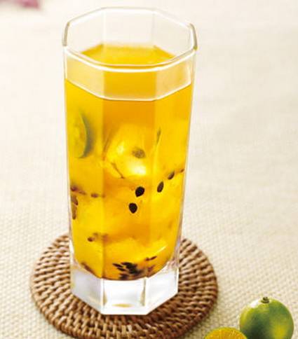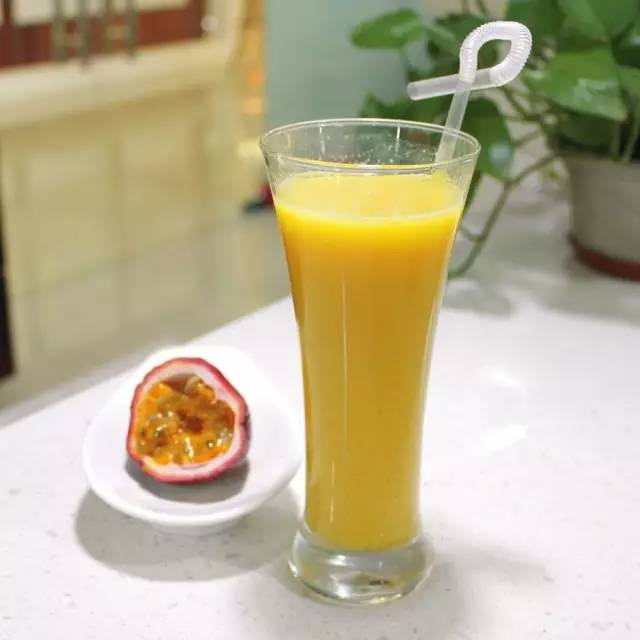 取一个百香果,切开挖取中间果汁(含种子),放入杯中,加200毫升水,加适量白糖浆调整甜度,搅拌即可得一杯色、香、味、营养俱佳的果汁。