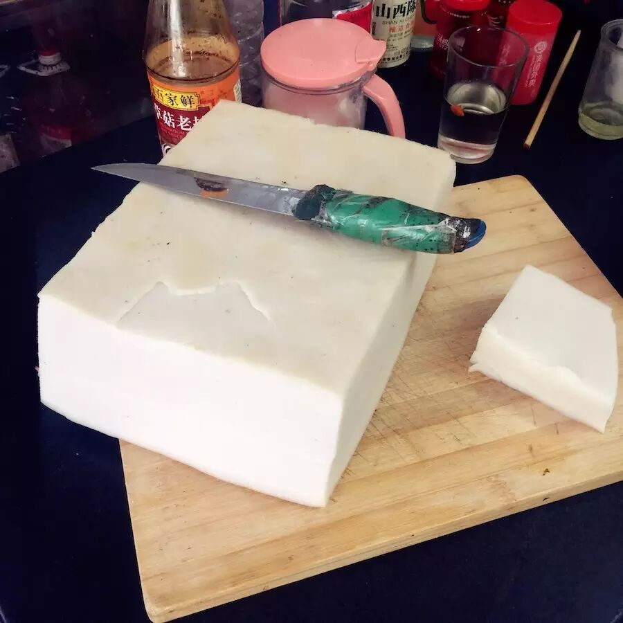 糕粿就是大块的白米糕,切成小块再去炒。做糕粿的时候,是一层层蒸好叠在一起的,所以很有咬劲。