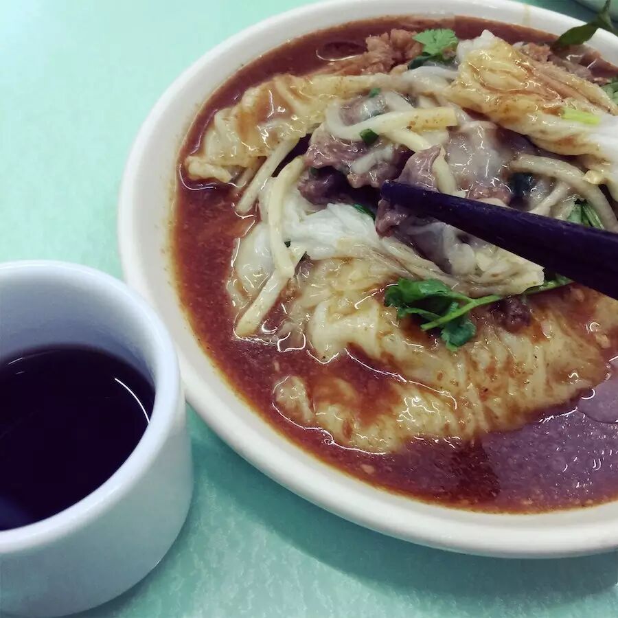 我们点了牛肉虾肠粉,里面的豆芽很加分,外面淋的酱油。汕头的肠粉和上海广式餐厅里吃到的码放整齐切好一段一段的那种肠粉不一样,出品比较豪放,拨开透透韧韧的肠粉,肚子里有一堆的料~