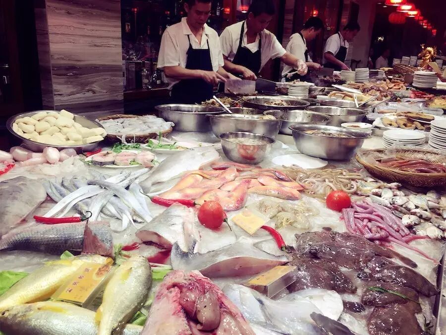 装修挺老派的,像那种国营的大饭店。因为事先订了座,被安排在了包间,没有最低消费,倒是蛮人性的。可以拿菜单点菜,也可以去打冷和海鲜的摊位。我们选择了后者,所以后来也发现错过了不少菜单上奇怪的菜色~