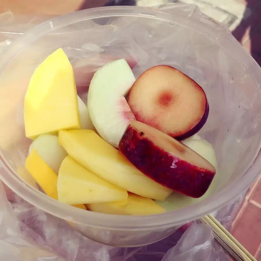 马路对面随便买了一份梅汁水果,芒果、桃子、布林都是生生的酸酸的口感,正好解腻。
