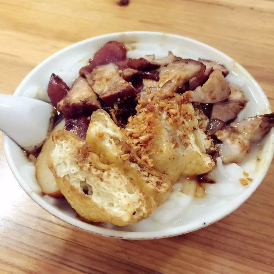 粿汁,是用米粉做成的粿条煮成的,粿条白白的,加上一勺子卤,上面再整齐得码上卤肉、肥肠、香肠、蛋、豆腐...
