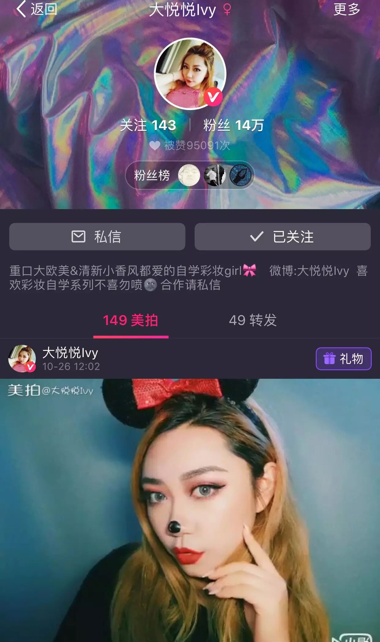 在今年的五月底,吕悦收到秒拍负责人的邀请,参加了在北京举办的秒拍自媒体仲夏夜,接触到了一些知名的美妆博主、造型师及搭配师等时尚潮流人士。随后在六月中旬,又受邀参加了厦门举办的美拍两周年生日会,与全国200 余位美拍达人一起分享心得,交流经验。问及活动的感受,吕悦说:“那些人都是自己大一关注的博主,感觉就好像是见到了偶像,大家都非常随和,没有人因为你的关注量才几万就看不起你,交流很愉快。”