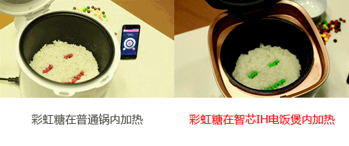 上面两个图可以看到,放在锅内的彩虹糖明显比盘子里的要快一些,首先是因为上面达人说的双线圈在底部和侧面同时形成涡流,一层高纯度紫铜用以优化锅壁的导电导热性,其加热的核心“涡流”就在这一层产生。玩儿的根本停不下,于是又加入了米饭: