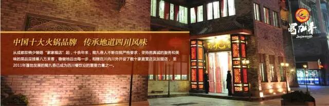 蜀九香是中国地道成都火锅品牌连锁店,是成都川式火锅的典范,拥有15年品牌历史。总部设立在成都,2000年,第一家蜀九香——成都双楠少陵路"家家福店"开张,13年,开始走“直营+加盟”路线,后成为中国10大火锅品牌和全国最大火锅品牌连锁,目前拥有全国70多家门店,遍布全国20多个城市,涵盖一线、二线城市,却能始终保持一种味道——最地道的成都火锅味。