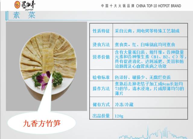 蜀九香火锅自开业以来,秉承“好菜品出自好人品”的经营理念,坚持博采众长,推陈出新,开成了独具一格的火锅特色:红汤红亮清润,香辣可口;白汤洁白似乳,鲜美回肠的独特风味,进而冠以品牌,注入内涵,引进珍馐美味,100余种菜肴,使川味火锅的独特神韵吸引了千千万万的美食家们。“食在四川,味在蜀九香”的美誉也随之不径而走。“蜀九香”由此得到了业界人士及中外食客的高度赞誉。