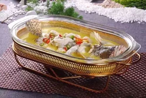 千岛湖鱼头2450克,盐水毛豆米、红杭椒丁、本地香芹段、鲜玉米、盐香花生仁、旺仔煎豆、京葱粒各50克,姜葱粒20克。