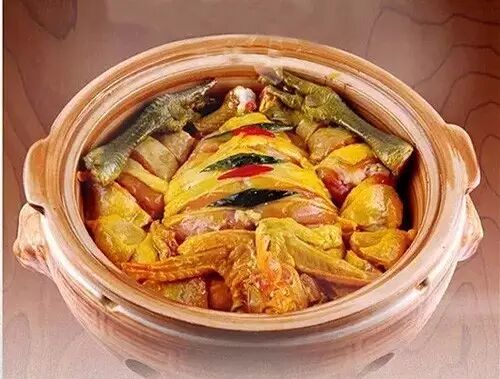 4、将土鸡、鸡肝、板栗、五花肉块、鸡胗、姜片、红干椒,重新放入汆鸡的原汤中小火煨1小时,将盖子揭开,看汤汁是否够用(因为有的瓦缸会漏水),再将盖子盖好用小火煨1小时,待汤汁粘稠、色泽金黄、表皮水分将干时离火,撒自制的香料粉、味精和葱花即可。