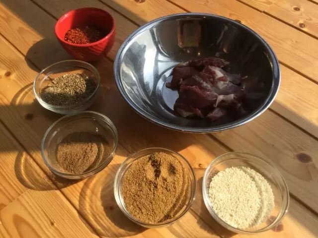 将羊肉切成大拇指大小的块状,用料酒、盐、糖、孜然粉和生抽腌制0.5小时