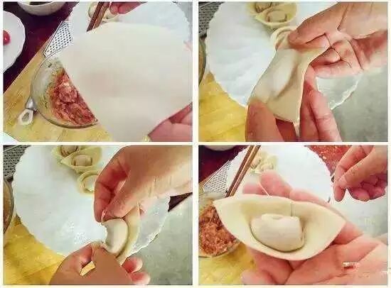 1.把饺子皮折起小半边,反过来包入馅料,然后对这捏合中间;