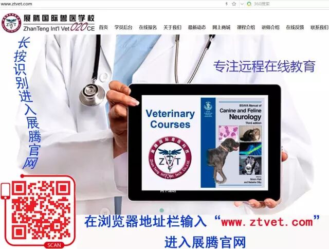 为方便兽医学习,展腾国际兽医学校官网及手机微网站全新上线了,各种兽医课程的视频应有尽有,欢迎广大兽医学员进入展腾官网“www.ztvet.com”观看更多资讯。