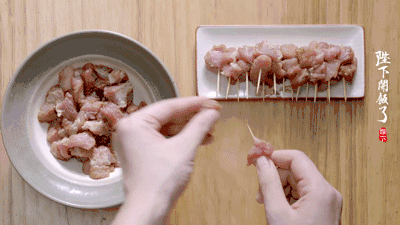 ① 串肉的时候小心别戳着手,转着牙签儿慢慢往里穿。