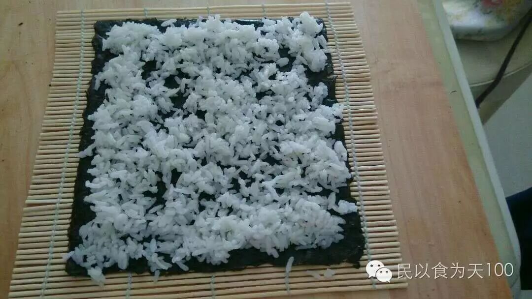 我取出寿司帘,铺上一片海苔,然后在把饭先在海苔四条边上铺一圈,再铺圈子里面,这样,比较容易铺均匀,且不会铺出来。看下图我的杰作!
