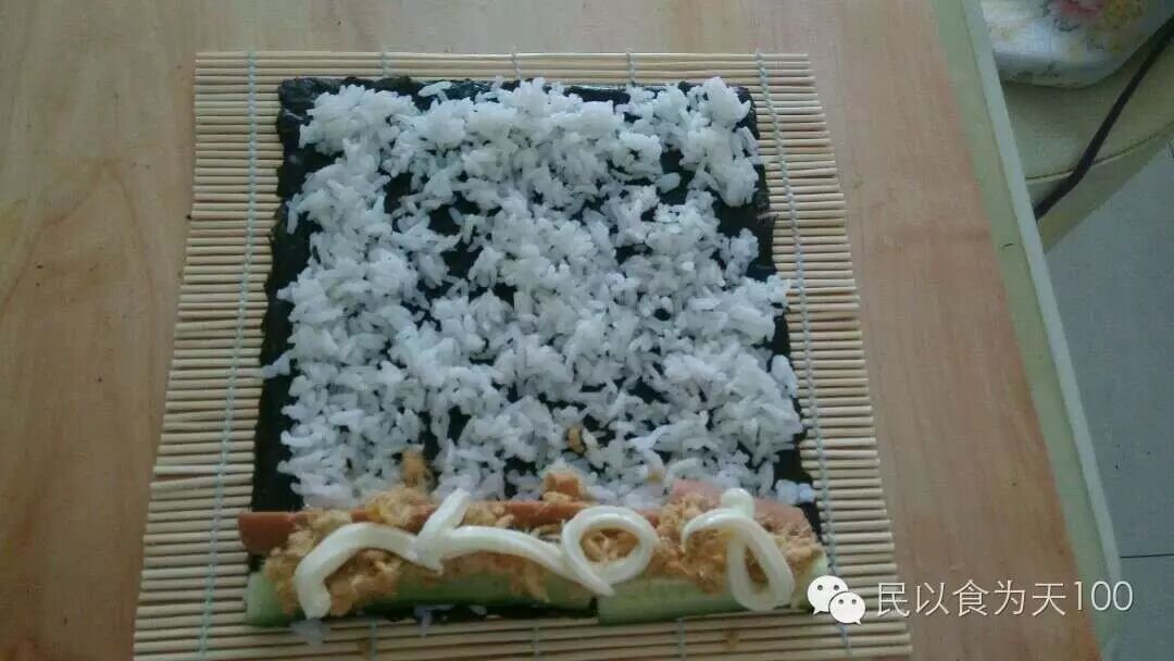 周六下午在家没事,脑瓜子里开始想各种吃的,眼睛也在家里四处搜罗起来,为瘦身,这一阵没去买零食,所以并没找到什么好吃的。最后,我的眼光落到电饭煲上,中午还剩了一些饭,我灵机一动,可以做寿司啊。