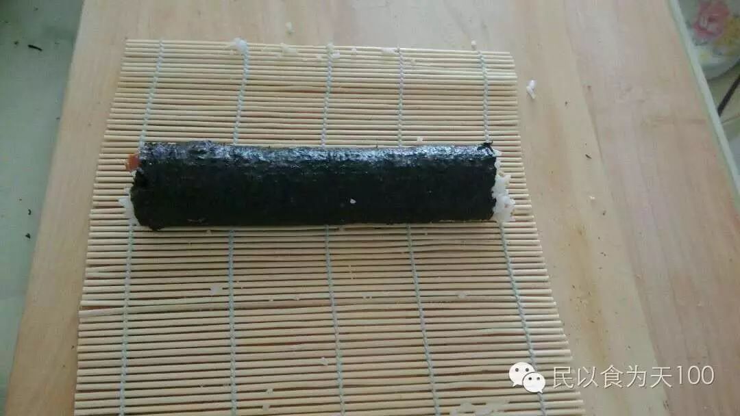 以前,我在超市看到寿司帘时,就很好奇,不知道该怎么卷,觉得卷的时候,帘子会一起卷进去,到时候怎么将帘子取出呢?总之,感觉是个迷。也觉得寿司自己肯定不会做,后来,看了同事手机中的自制寿司图片,觉得自己也可以试一试,不会刚好还有人可以问一下。说做就做,我很快网购了寿司帘,寿司海苔。开始做了,先从网上搜了视频看了下怎么卷,发现,原来寿司帘只是辅助作用,根本不需卷进去,整个过程,都是海苔,饭们在卷,寿司帘只是推着它们打着滚向前,也就是说,寿司帘只是起个保护作用,怕海苔太脆,也卷不紧。有寿司帘就不一样了,可以卷得很紧,看下图。