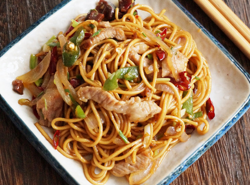 面条 200克、猪肉 100克、生抽 2茶匙、黄酒 1茶匙、蚝油 1茶匙、拌饭酱 1茶匙、葱 1小段、干辣椒 2个、盐 1茶匙、洋葱 1个、青辣椒 1根、植物油 2.5汤匙、淀粉 2茶匙