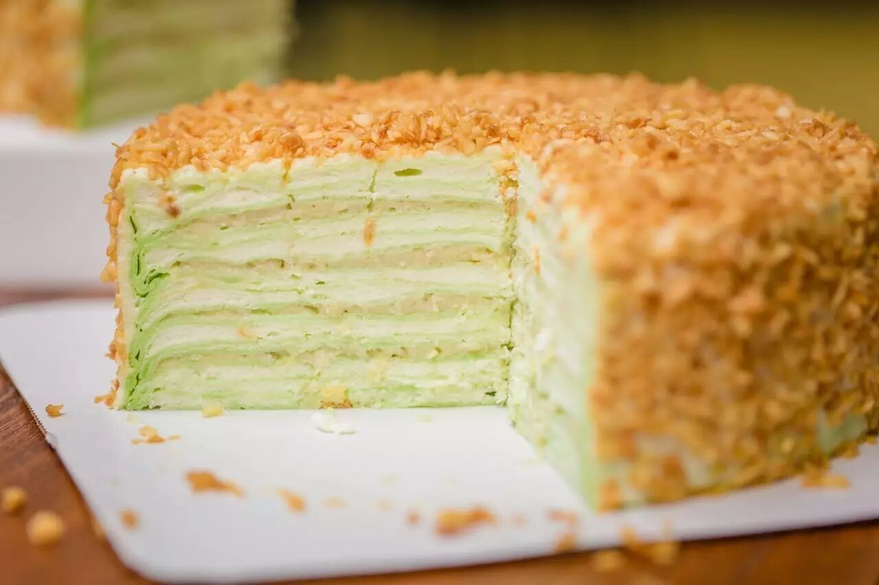这榴莲千层跟我们平时吃的很不一样,总之让人惊喜万分!整块千层看起来十分小清新,其实那是班兰叶的自然绿呀!铺面的椰蓉和榴莲肉竟然毫无违和感地Mix到一块去了,口感十分丰富!