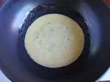 8:大约2分钟左右,饼底部已熟,晃动锅,饼会离开锅底。