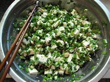 10:把豆腐和韭菜混合,调入少许盐、鸡精,淋入1汤勺熬熟但已冷却的香葱油,搅拌均匀。