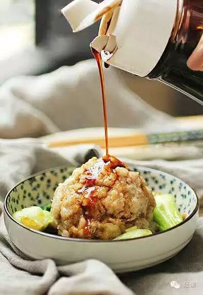 再下一步是蒸。碗里先放一层转刀块冬笋垫底,再不然就横切黄芽白作墩形数个也好。把炸过的丸子轻轻放在碗里,大火蒸一个钟头以上。揭开锅盖一看,浮着满碗的油,用大匙把油撇去,或用大吸管吸去,使碗里不见一滴油。