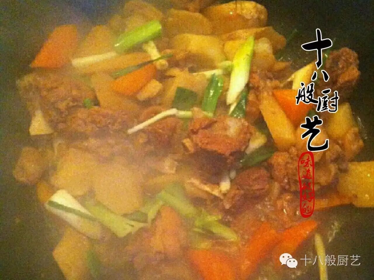 2、锅里少油加入十颗冰糖融化后加入羊肉拌均,再加入老姜、胡萝卜炒,调入料酒、酱油、耗油、盐、鸡精、香料;