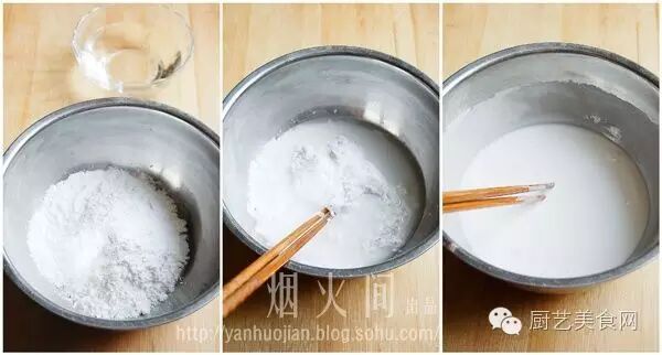 1、小麦淀粉倒入盆内,加入2倍左右的清水,边加边用筷子搅拌,搅拌成比较稀的面糊(面糊呈柔和的线状流下,而不是断续地滴下来)。