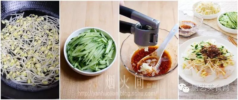11、吃的时候,将切成条的凉皮,拌入豆芽、黄瓜丝和料汁拌匀即可。