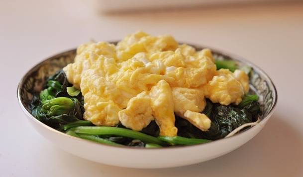 6.在鸡蛋还没有成型的时候用筷子在中间划圈,在鸡蛋即将凝固的时候出锅,铺到菠菜上面即可。
