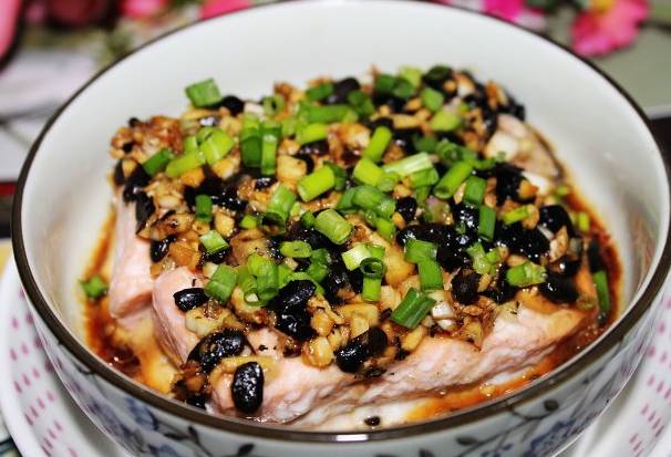 三文鱼、橄榄油、盐、生抽、白糖、料酒、蒜蓉、豆豉、葱花