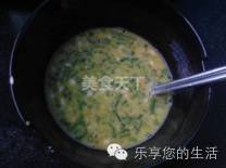 5、平底锅加油烧热,先倒入一半的蛋液,小火煎