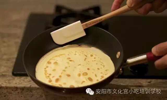 最理想的状况就是,面糊进锅后,始终保持平静状态(没有出现大量气泡),等你把锅子转动一周,面糊可以流动到锅子的各个角落,形成一个平整的薄饼,同时开始渐渐变得凝固。