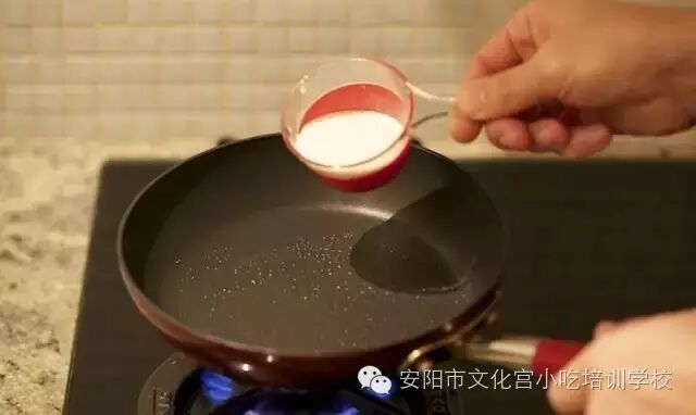 首先要确定一张可丽饼所需的面糊的量,对于照片里面的这种直径20厘米的锅子,每张饼用到的面糊在30-40毫升之间,所以你需要一个有精确刻度的量勺。开始的时候可以稍稍变动一下面糊的量,直到找到自己最满意的效果为止。