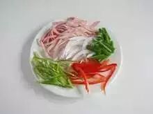 2:培根、洋葱、青红椒分别切成细丝,香葱切段。
