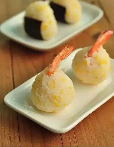 12、另一款三用饭团的做法类似,包入整颗虾仁,捏成三角,然后包上一块紫菜即可。