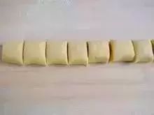 7:案板上撒少许糯米粉,把南瓜面团揉成长条。