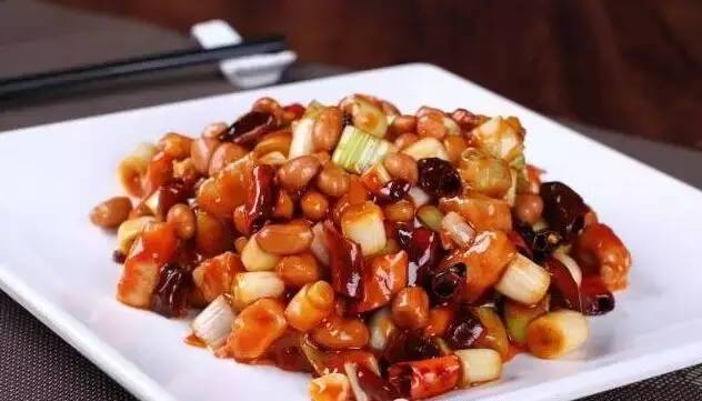 4.放入鸡丁炒至变色后,将青红椒粒放入,翻炒10秒钟,倒入调好的料汁,大火翻炒1分钟后,倒入炸好的花生米即可。