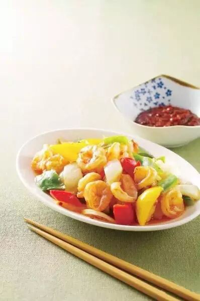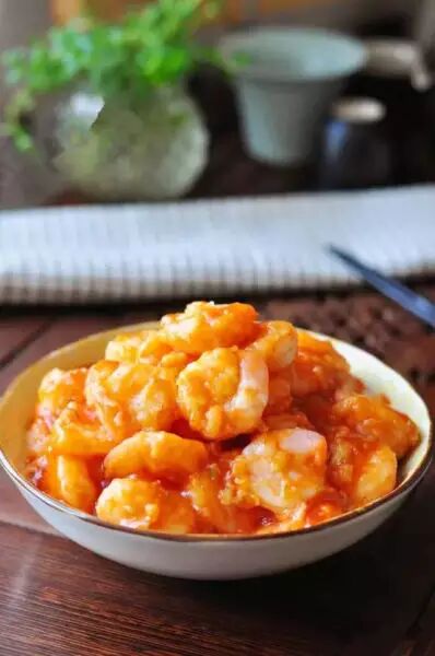 虾仁150公克、蕃茄2颗、蒜末1/2茶匙、水50㏄、葱花1茶匙、蕃茄酱1大匙、醋1茶匙、糖1大匙、盐1/2匙、太白粉水1茶匙。