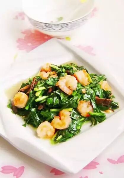 虾仁30克、韭菜250克、鸡蛋1个、食盐、酱油、淀粉、植物油、麻油各适量。