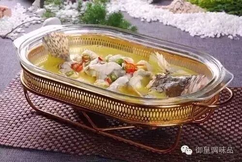 3、锅放油烧至六成热,锅内放入野山椒小火炒香,加入特制酸汤、宽粉、盐、鱼露、香醋、白糖、珍膳味五谷原味鸡精调好味道,大火烧开,淋在蒸好的鱼上,撒上小米椒即可、上菜时在盘底点上酒精炉,既能使宽粉软滑,能增加气氛。