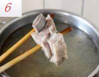 2.飞水:水开,将泡好、洗净的羊肉下锅,待开,略滚几下,将脏水倒掉,羊肉再次冲洗干净。